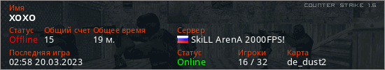 Играет на Counter Strike 1.6 сервере. Страна: РоссияПервый раз замечен 02:41 20.03.2023