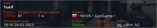 Играет на Counter Strike Source сервере. Страна: РоссияПервый раз замечен 08:19 26.02.2023