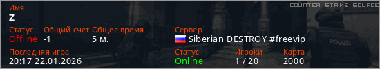 Играет на Counter Strike Source сервере. Страна: РоссияПервый раз замечен 20:02 22.01.2026