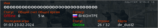 Играет на Counter Strike 1.6 сервере. Страна: РоссияПервый раз замечен 01:01 23.02.2024
