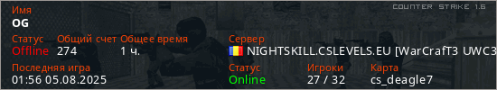 Последний раз был в сети 01:56 05.08.2025 Игрок с таким ником замечен на 30 серверах