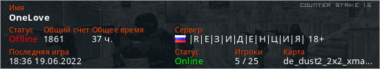 Играет на Counter Strike 1.6 сервере. Страна: РоссияПервый раз замечен 17:34 31.05.2022