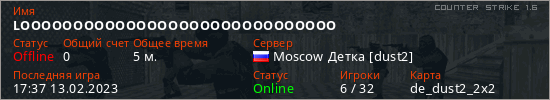 Играет на Counter Strike 1.6 сервере. Страна: РоссияПервый раз замечен 17:35 13.02.2023