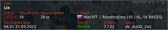 Играет на Counter Strike 1.6 сервере. Страна: РоссияПервый раз замечен 04:15 31.05.2023