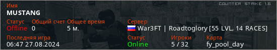 Играет на Counter Strike 1.6 сервере. Страна: РоссияПервый раз замечен 06:43 27.08.2024