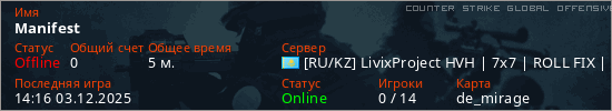 Играет на Counter Strike Global Offensive сервере. Страна: КазахстанПервый раз замечен 14:14 03.12.2025