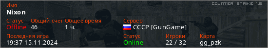 Играет на Counter Strike 1.6 сервере. Страна: РоссияПервый раз замечен 09:58 01.09.2024