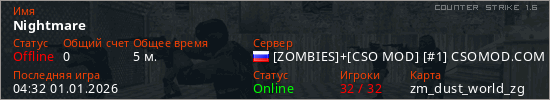 Играет на Counter Strike 1.6 сервере. Страна: РоссияПервый раз замечен 04:19 01.01.2026