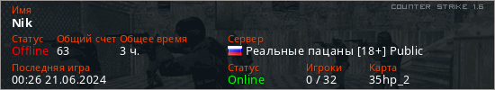 Играет на Counter Strike 1.6 сервере. Страна: РоссияПервый раз замечен 01:26 11.03.2023