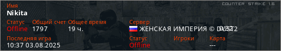 Играет на Counter Strike 1.6 сервере. Страна: РоссияПервый раз замечен 11:52 04.08.2021