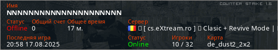 Играет на Counter Strike 1.6 сервере. Страна: РумынияПервый раз замечен 17:32 16.08.2025