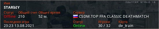 Играет на Counter Strike 1.6 сервере. Страна: РоссияПервый раз замечен 07:36 09.08.2021