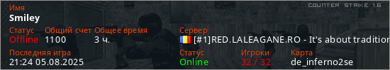 Играет на Counter Strike 1.6 сервере. Страна: РумынияПервый раз замечен 18:46 20.02.2024