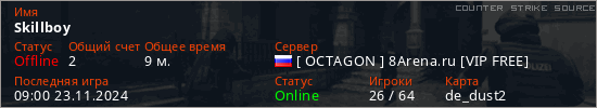 Играет на Counter Strike Source сервере. Страна: РоссияПервый раз замечен 08:25 23.11.2024