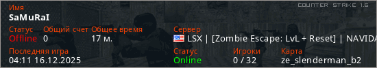 Играет на Counter Strike 1.6 сервере. Страна: СШАПервый раз замечен 03:54 16.12.2025