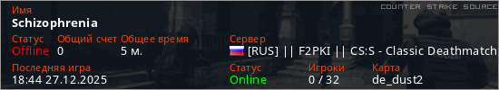 Играет на Counter Strike Source сервере. Страна: РоссияПервый раз замечен 18:40 27.12.2025