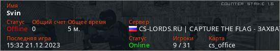 Играет на Counter Strike 1.6 сервере. Страна: РоссияПервый раз замечен 15:24 21.12.2023