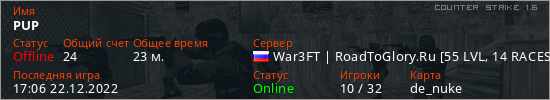Играет на Counter Strike 1.6 сервере. Страна: РоссияПервый раз замечен 16:45 22.12.2022