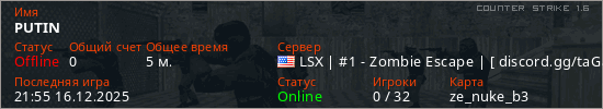 Играет на Counter Strike 1.6 сервере. Страна: СШАПервый раз замечен 21:51 16.12.2025