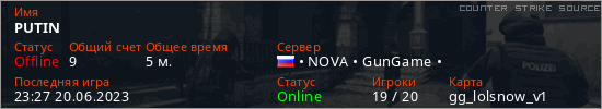 Играет на Counter Strike Source сервере. Страна: РоссияПервый раз замечен 23:19 20.06.2023