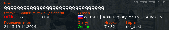 Последний раз был в сети 21:45 19.11.2024 Игрок с таким ником замечен на 14 серверах