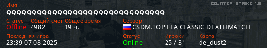 Последний раз был в сети 23:39 07.08.2025 Игрок с таким ником замечен на 14 серверах