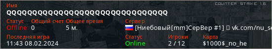 Играет на Counter Strike 1.6 сервере. Страна: РоссияПервый раз замечен 11:41 08.02.2024