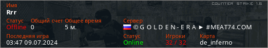 Играет на Counter Strike 1.6 сервере. Страна: РоссияПервый раз замечен 03:39 09.07.2024