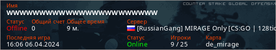 Играет на Counter Strike Global Offensive сервере. Страна: РоссияПервый раз замечен 14:50 06.04.2024
