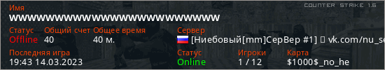 Играет на Counter Strike 1.6 сервере. Страна: РоссияПервый раз замечен 00:00 12.03.2023