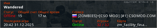 Играет на Counter Strike 1.6 сервере. Страна: РоссияПервый раз замечен 15:39 30.12.2025