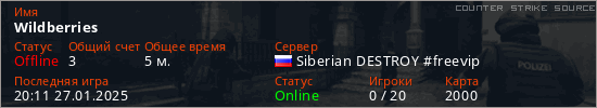 Играет на Counter Strike Source сервере. Страна: РоссияПервый раз замечен 20:05 27.01.2025