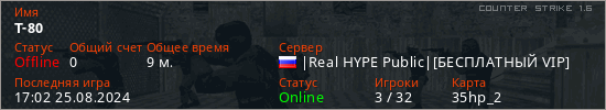 Играет на Counter Strike 1.6 сервере. Страна: РоссияПервый раз замечен 15:33 29.12.2023