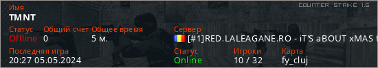 Играет на Counter Strike 1.6 сервере. Страна: РумынияПервый раз замечен 20:25 05.05.2024