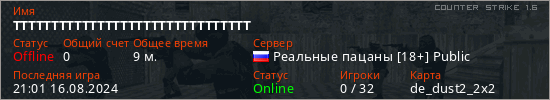 Играет на Counter Strike 1.6 сервере. Страна: РоссияПервый раз замечен 16:56 08.03.2024