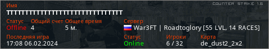 Играет на Counter Strike 1.6 сервере. Страна: РоссияПервый раз замечен 16:39 06.02.2024