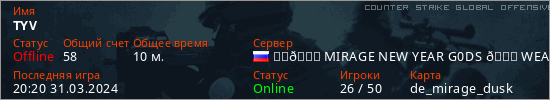 Играет на Counter Strike Global Offensive сервере. Страна: РоссияПервый раз замечен 19:53 31.03.2024