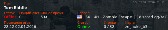 Играет на Counter Strike 1.6 сервере. Страна: СШАПервый раз замечен 22:18 02.01.2026