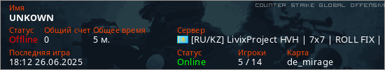 Играет на Counter Strike Global Offensive сервере. Страна: КазахстанПервый раз замечен 18:10 26.06.2025
