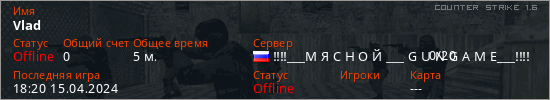 Играет на Counter Strike 1.6 сервере. Страна: РоссияПервый раз замечен 18:05 15.04.2024
