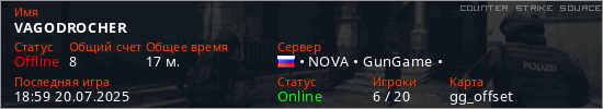 Играет на Counter Strike Source сервере. Страна: РоссияПервый раз замечен 18:45 26.06.2025