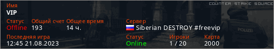 Играет на Counter Strike Source сервере. Страна: РоссияПервый раз замечен 19:21 10.03.2023