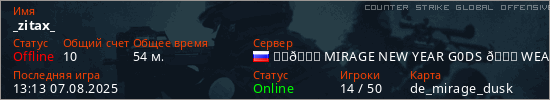 Играет на Counter Strike Global Offensive сервере. Страна: РоссияПервый раз замечен 15:45 27.07.2025