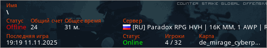 Играет на Counter Strike Global Offensive сервере. Страна: РоссияПервый раз замечен 20:17 11.09.2025