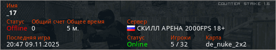 Играет на Counter Strike 1.6 сервере. Страна: РоссияПервый раз замечен 20:22 09.11.2025