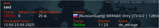 Играет на Counter Strike Global Offensive сервере. Страна: РоссияПервый раз замечен 10:02 22.09.2025
