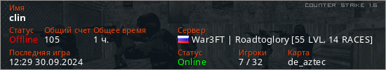 Играет на Counter Strike 1.6 сервере. Страна: РоссияПервый раз замечен 20:56 13.06.2022