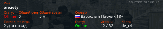 Играет на Counter Strike 1.6 сервере. Страна: РоссияПервый раз замечен 18:46 15.12.2025