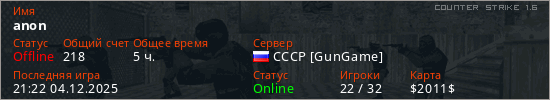 Играет на Counter Strike 1.6 сервере. Страна: РоссияПервый раз замечен 11:20 13.01.2024