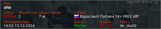 Играет на Counter Strike 1.6 сервере. Страна: РоссияПервый раз замечен 13:42 15.12.2024